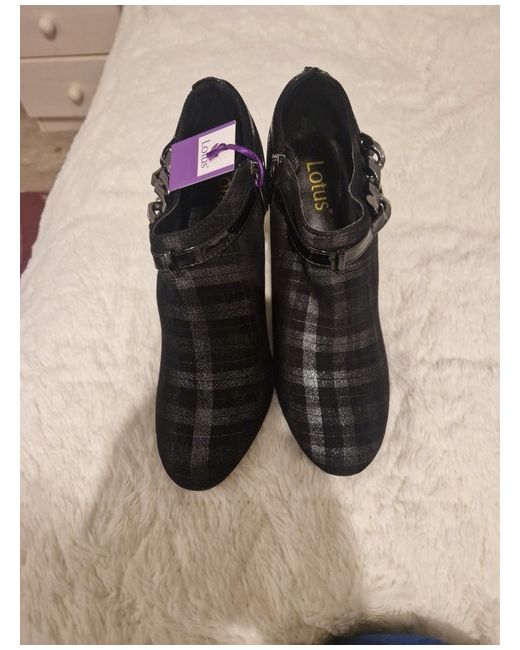 STILETTO HEELED ALMOND TOE SHOE BOOT FEATURING A CHECK TEXTILE UPPER ,DECORATIVE METAL TRIM AND FUNCTIONAL INSIDE ZIP comes with spear tip for the stiletto