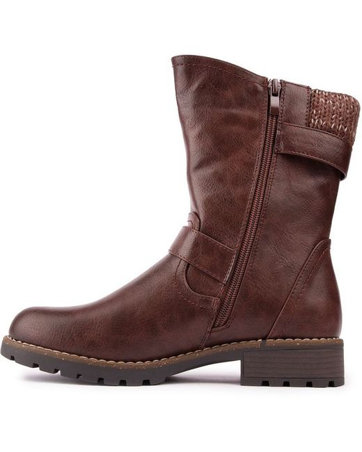 Add a fashionable spin to any outfit with the Lotus Jemima boots. These women's biker-inspired boots incorporate two wrap-around straps complete with buckle trims on the faux leather upper. The knitted textile collar, the cleated sole and the subtle 3.5cm heel all add to the look of this Lotus calf-length staple, an ideal companion for the changing season.