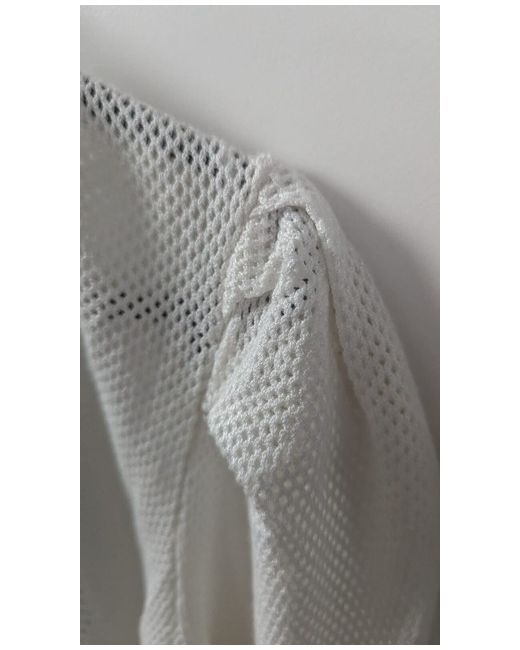 This is a white DKNY cardigan in size medium for women. It has long sleeves, a V-neckline, and is lined with black.