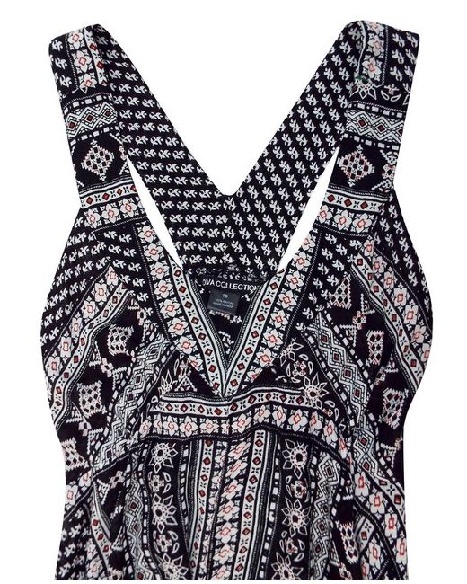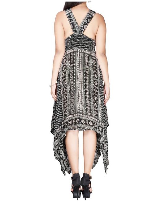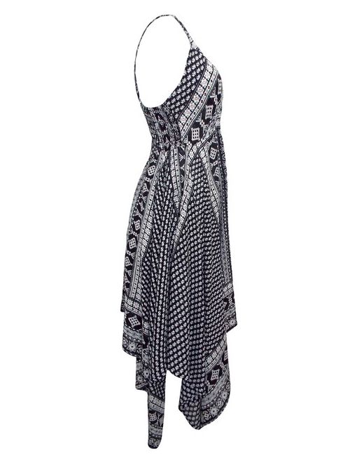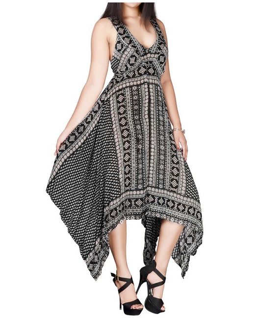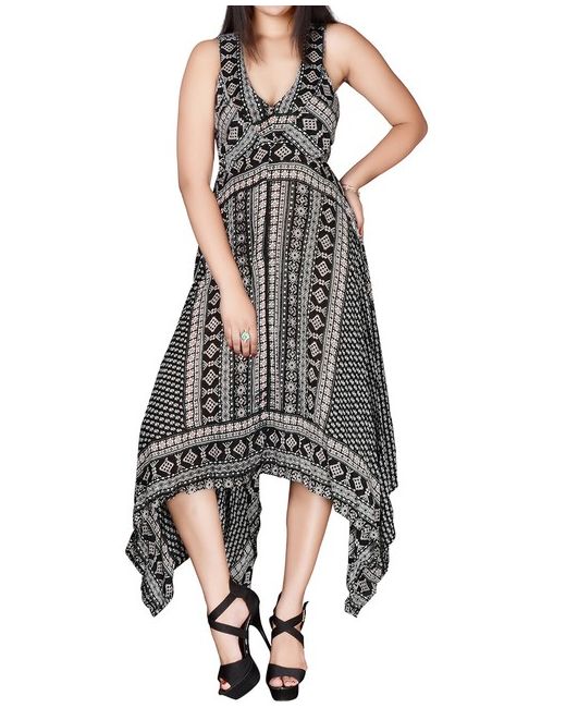 By Diva Collection. Black Floral Border Print Handkerchief Hem Dress. Light rayon handkerchief printed dress with a banded -shape neckline and racer back. Material: 100% Rayon.