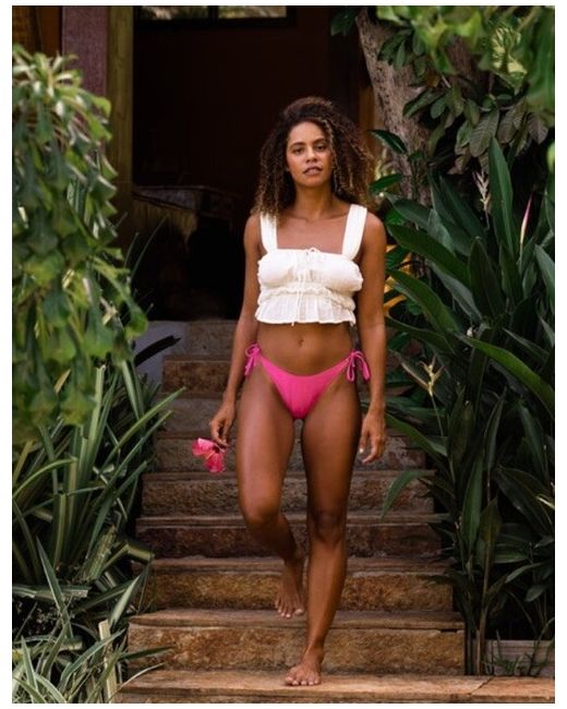 Features Fabric: Soft, recycled, resistant and stretch nylon blend fabric Coverage: Bikini coverage Rise: Mid rise Closure: Ties closure Branding: ROXY rubber plate. Composition [Main Fabric] 87% Recycled Nylon, 13% Elastane Size medium