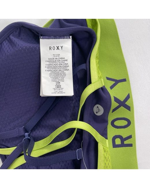 Comfy, high support ROXY sports bra made from three layers of fabric with removable pads. Double straps, green ones are crossed at the back and the navy ones have an optional hook, so you can wear them two ways. Labelled as LARGE. NEW, but the paper tags are missing.