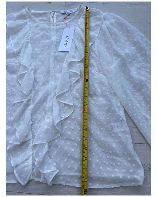 White Dobby Ruffle Front Blouse. This beautiful dobby ruffle front blouse will be a must have wardrobe staple. In a stunning ivory colour way. Featuring long sleeve and elastic cuffs with round neckline.