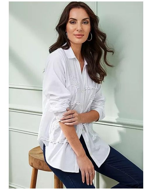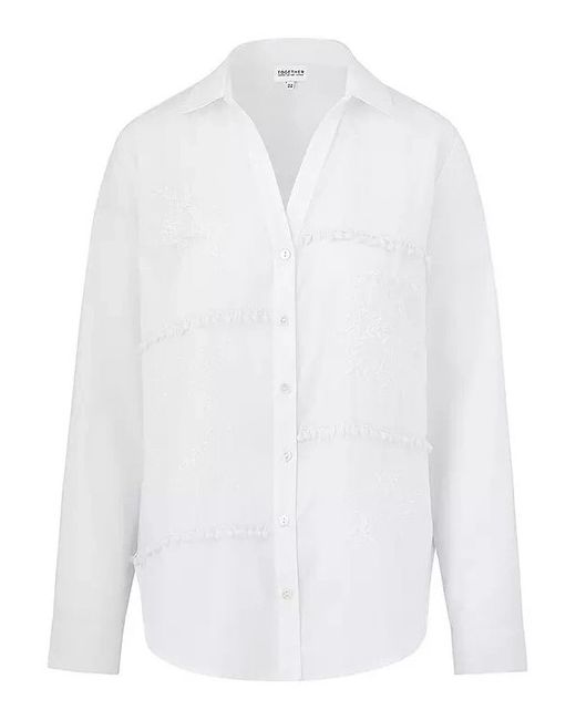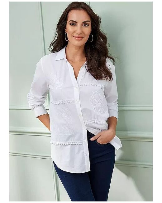 Machine washable. Length approx. 72 cm (28 in). This super easy white shirt is so pretty with long sleeves and white embroidery detail and cute pom poms to the front. Looks great worn with a Trench Coat.