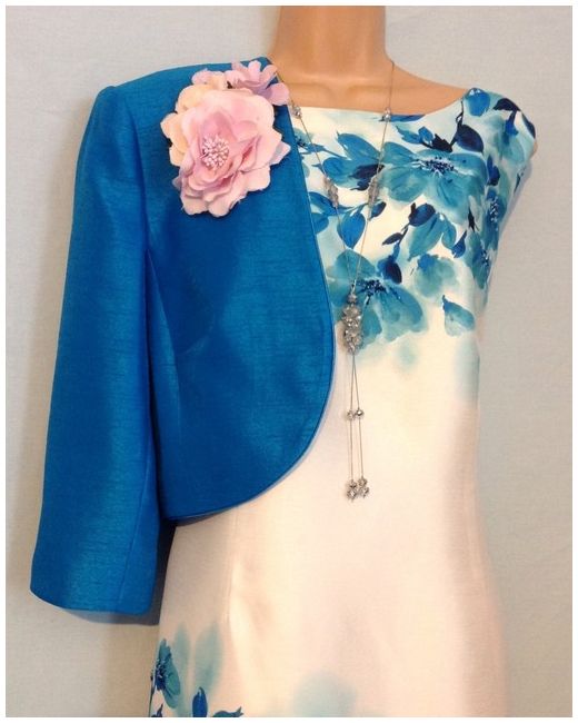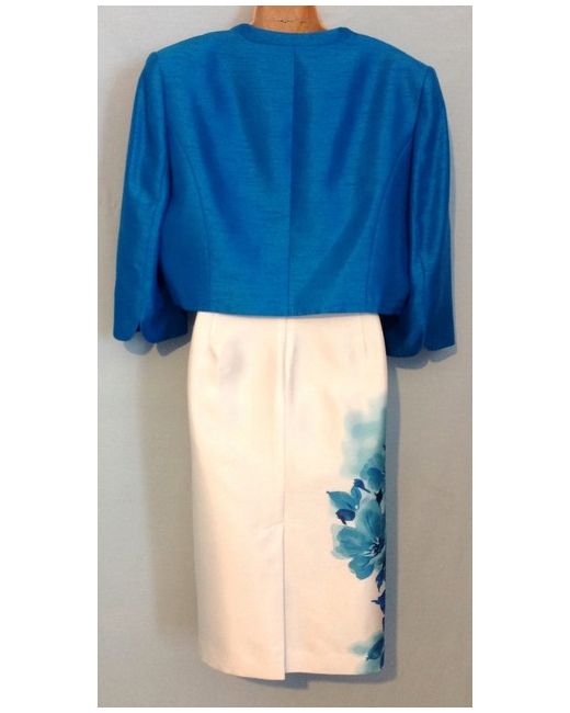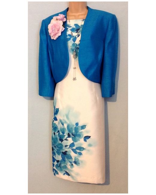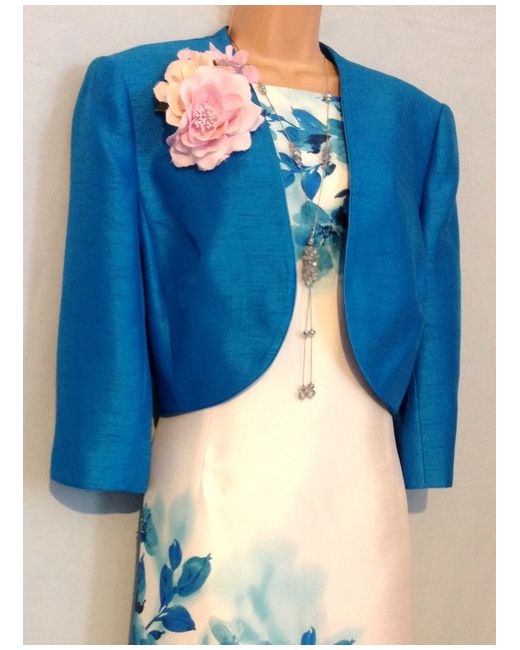 JACQUES VERT. Fully Lined, Ivory, Blue & Turquoise, Beaded, Cocktail Party Dress with Long Sleeved, Bolero Jacket - Size UK 18. Long sleeved open bolero jacket. Material - viscose, polyester over a satin polyester lining.