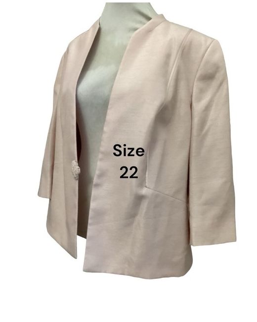 Jacques Vert Pink Jacket Size 22 Pristine. Length 22 1/2” Tapework button with hook fastening Outside sleeve length 18” Inner sleeve. Length 11” Pit 25” Satin vertical detailing Says dry clean, but nowadays smart washing machines have a delicate or silk wash Fmio downstairs 3/24