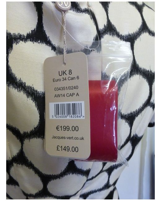 It is a spotty design with short sleeves, back split & is fully lined. Stunning classic cream & black dress from Jacques Vert. 100% polyester.