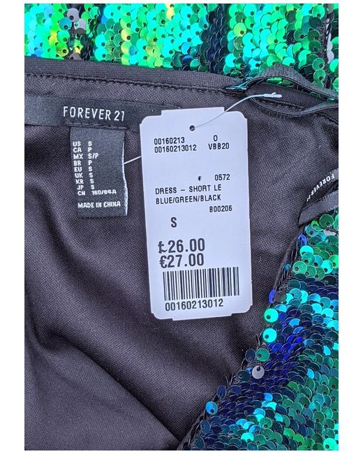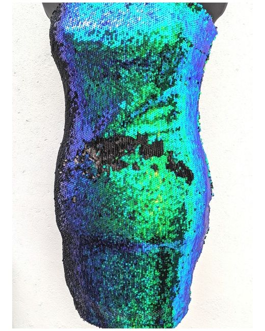 Glam sequin dress for those occasions when a bit of sparkle is required. It is covered with two-toned sequins in a fish-scale design that can be flipped sideways to show either an iridescent blue-green or plain black.