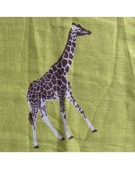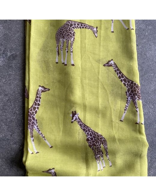 Scarf has never been worn and is in new condition. Lightweight scarf with giraffes on a soft lime green background. Very large but thin material. 100% polyester.