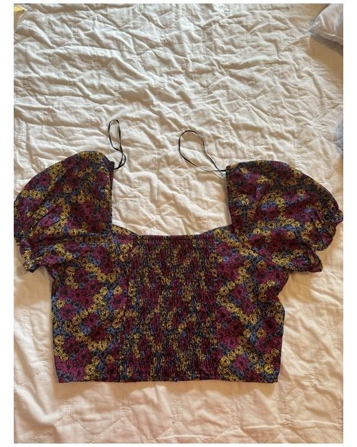 Purple, yellow and blue floral print. Very comfortable and very flattering on. Only selling as no longer fits.