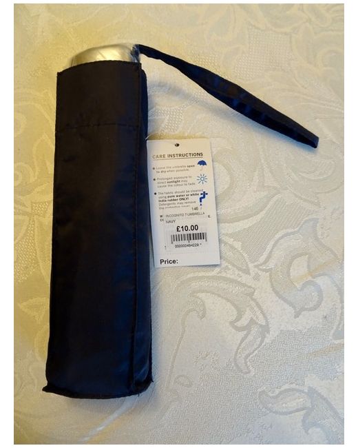 This is a super flat plain navy umbrella that easily fits into a handbag. Incognito brand. When folded it measures 22 cm long, and is 2.5 cm thick. It weighs only 148 grams.
