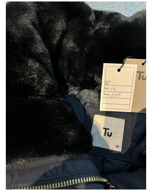 New navy blue puffa jacket size 14. Warm & cosy soft black fur neck & around hood, zip & popper front, zip pockets, flattering pleated side panelling, from TU Excellent gift 🎁. RRP £69.00