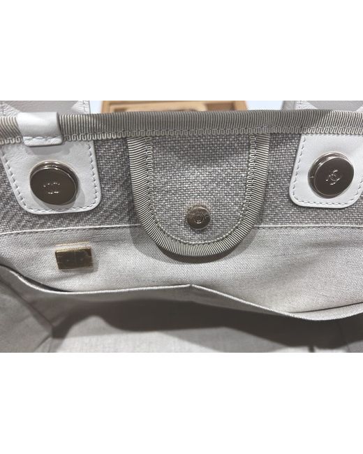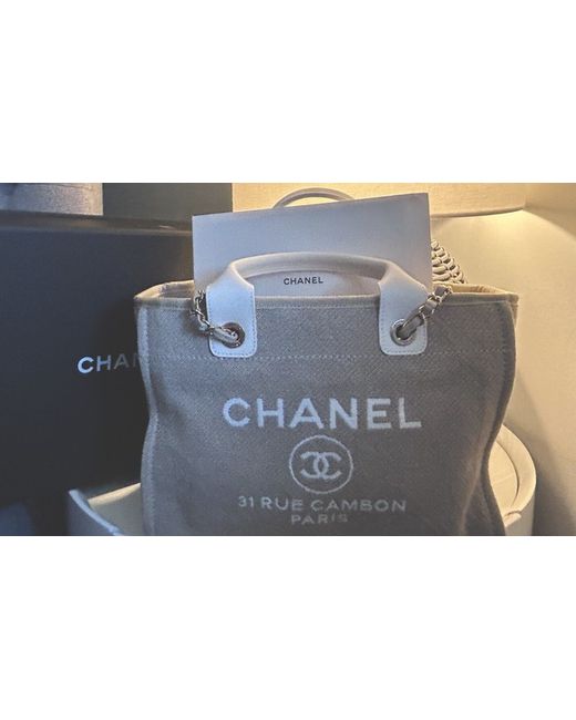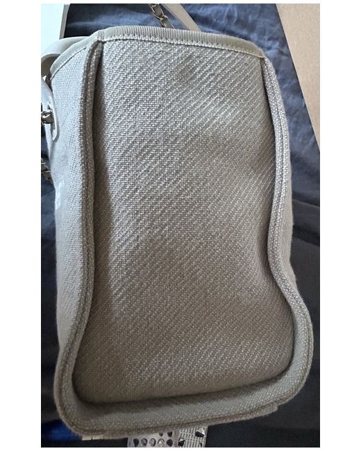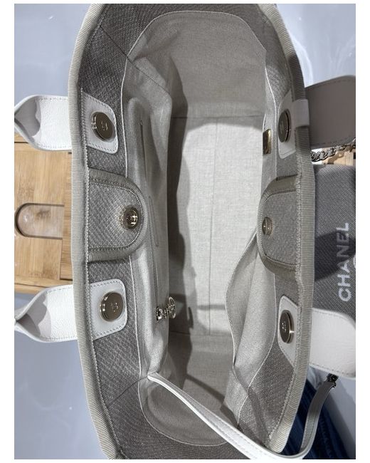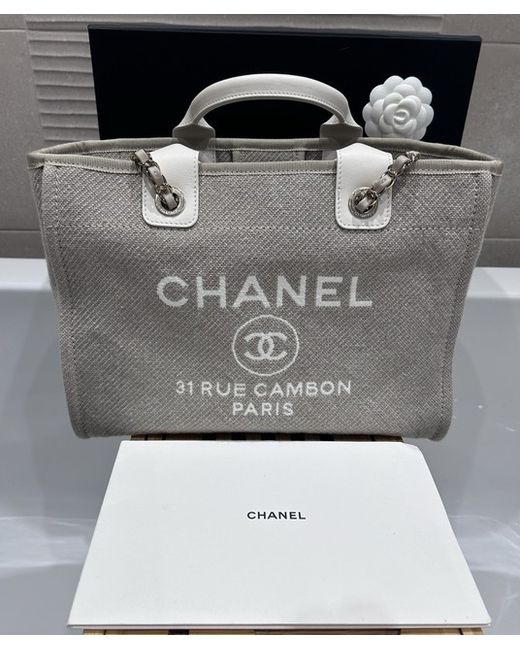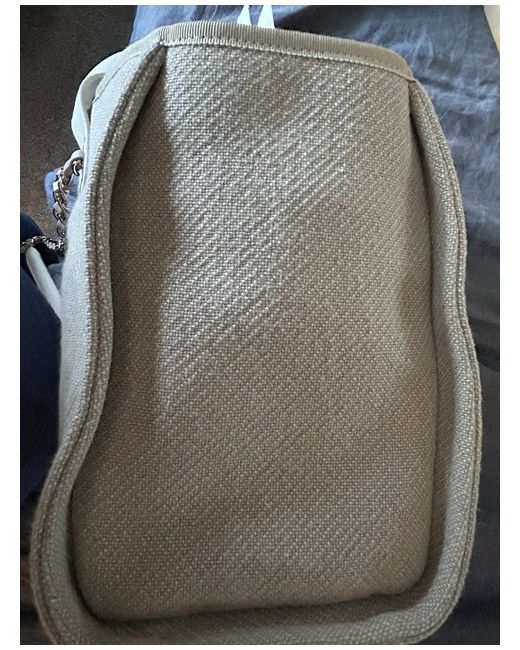 This CHANEL Deauville tote bag is a small designer handbag made of beige canvas with white leather handles/straps and gold-plated hardware. The bag features a solid pattern, magnetic closure, and a lining of beige cotton. It has dimensions of 33 cm in width, 24 cm in height, and 16 cm in depth. The tote includes inner pockets, a removable pouch, and a chain strap, and comes with accessories such as a pouch, original dust bag, and original box, making it a stylish and functional accessory for women who appreciate luxury fashion.