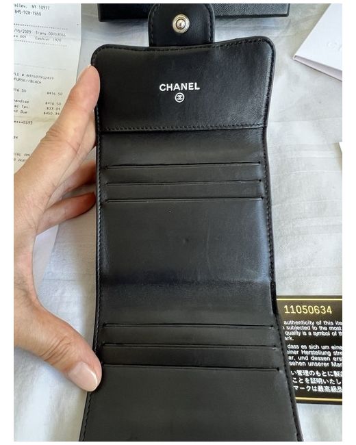 Classic Chanel Tri Fold Wallet Black Lamb Skin with silver hardware New with Box, Tags, Receipt Hardware is in pristine condition, no signs tarnish Please check all photos for measurements of wallet Please ask all questions before buying as sale is final no return International Buyers are responsible for any taxes Thank You for browsing