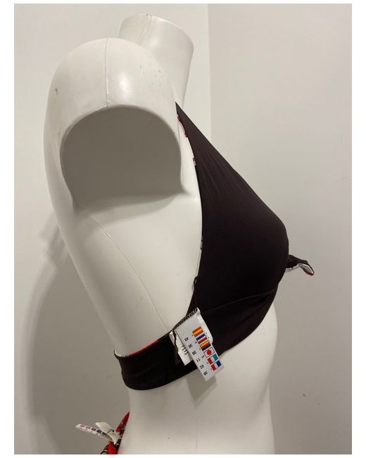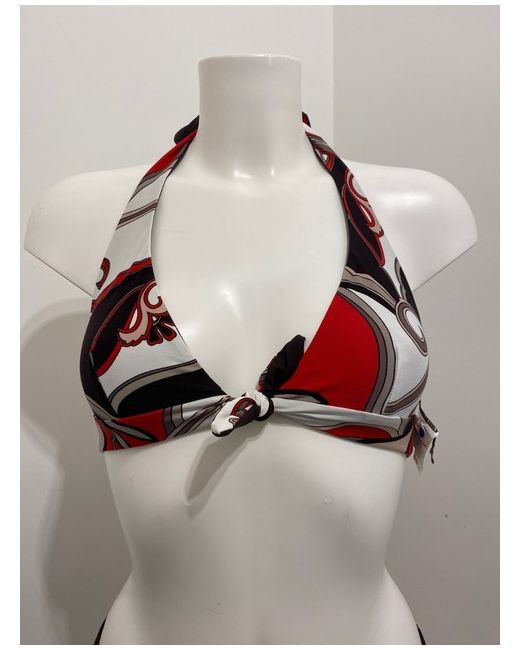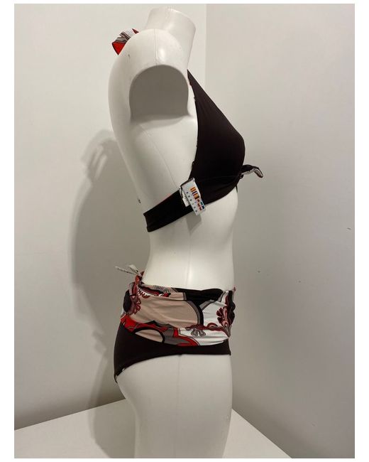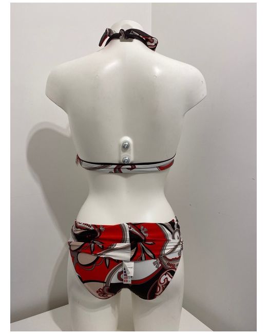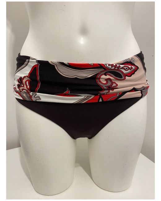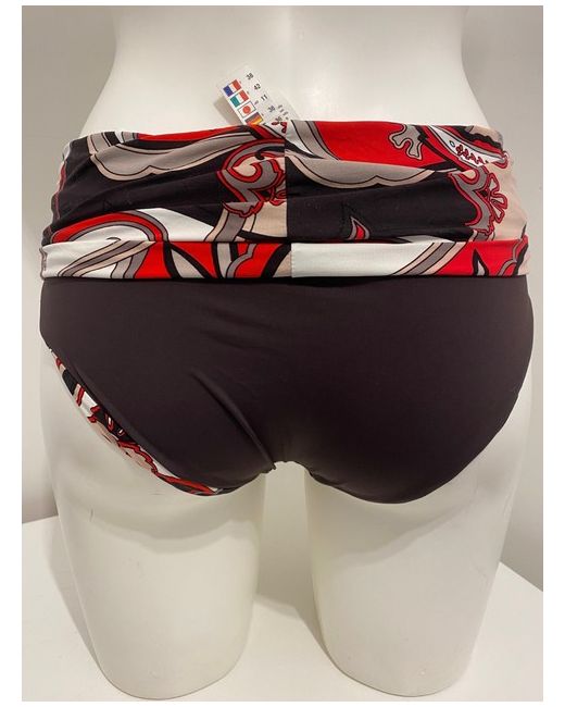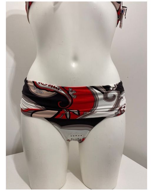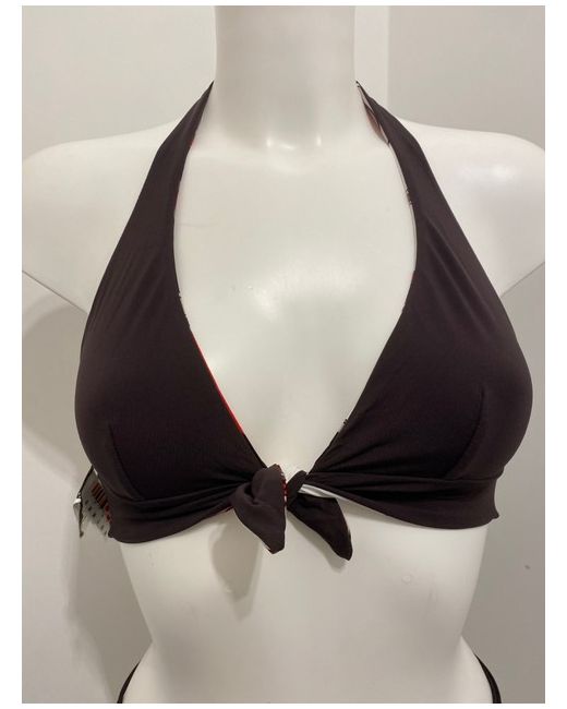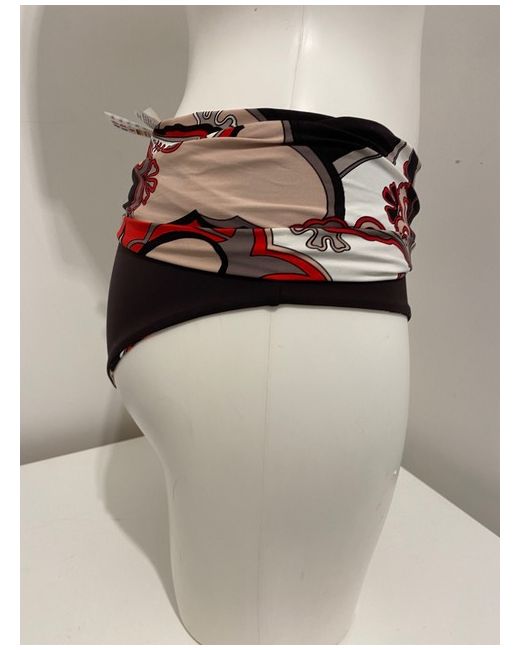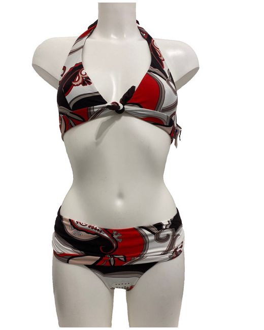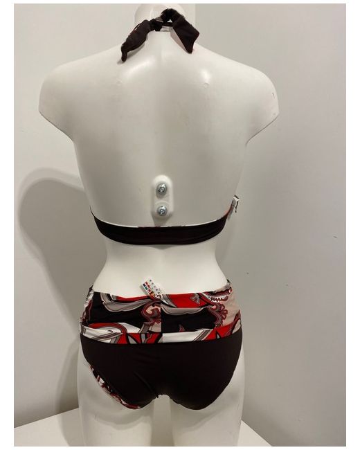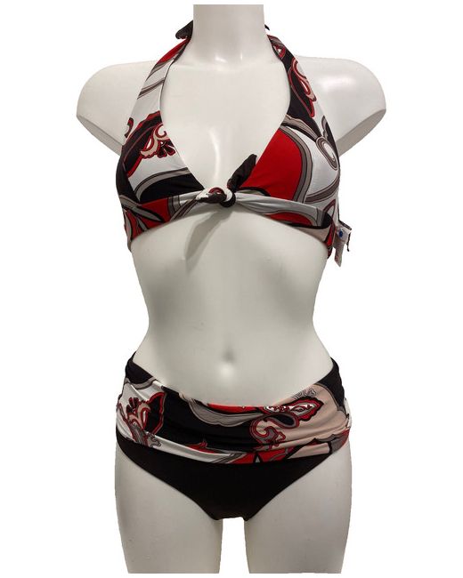 Moontide Reversible Bikini Set in Cocoa & Red. Halterneck tie and smooth back. Complete with matching foldover fold down pant bikini bottoms. One side is red floral print, the other side is cocoa brown.