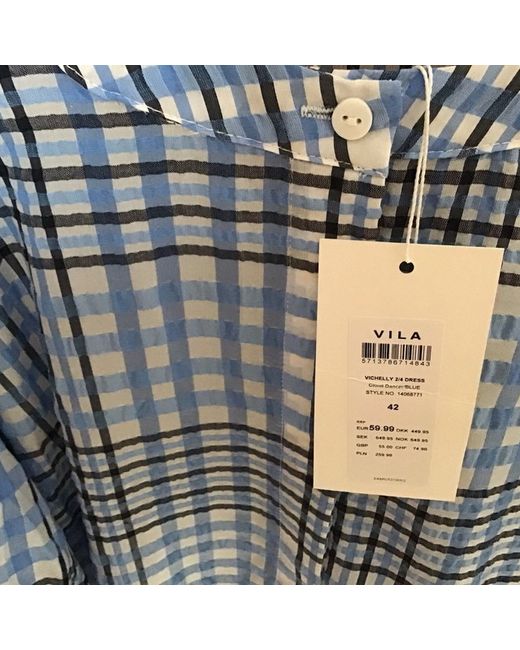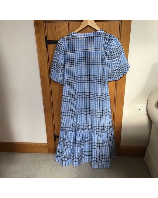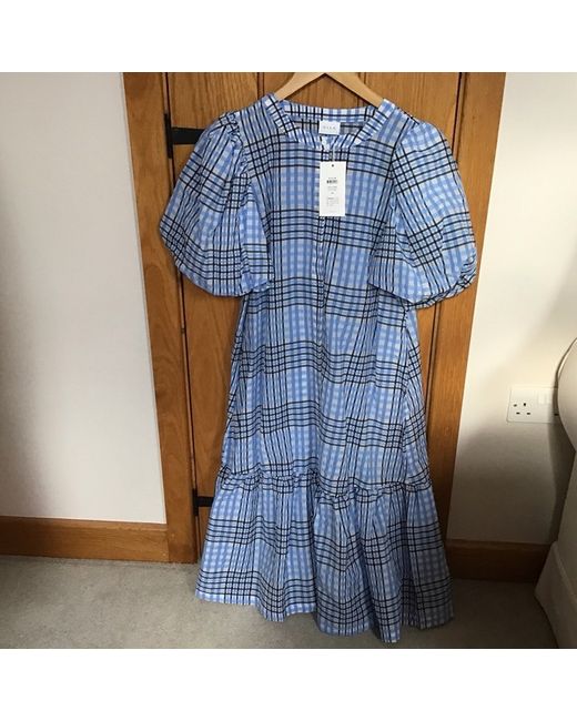 A brand new dress from villa blue black silver / grey check slight sheen to it Size 42 Unlined button through Puff sleeves which are lined Frill at the bottom buttons don’t go all the way down Crease free