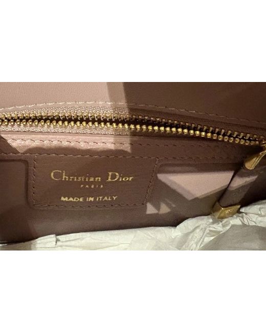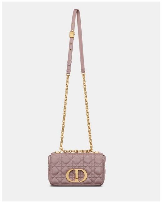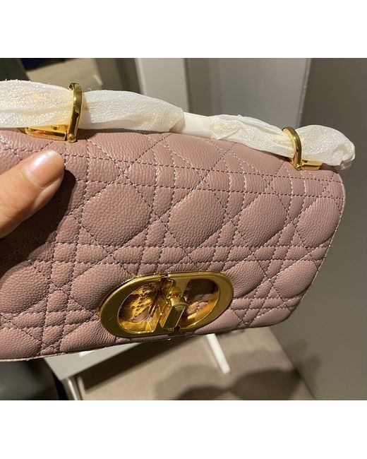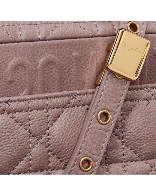 The style is crafted in pink supple calfskin with Cannage stitching. Adjustable, detachable CD chain link strap with Christian Dior Paris military-inspired buckle. Interior zip pocket and slip pocket.