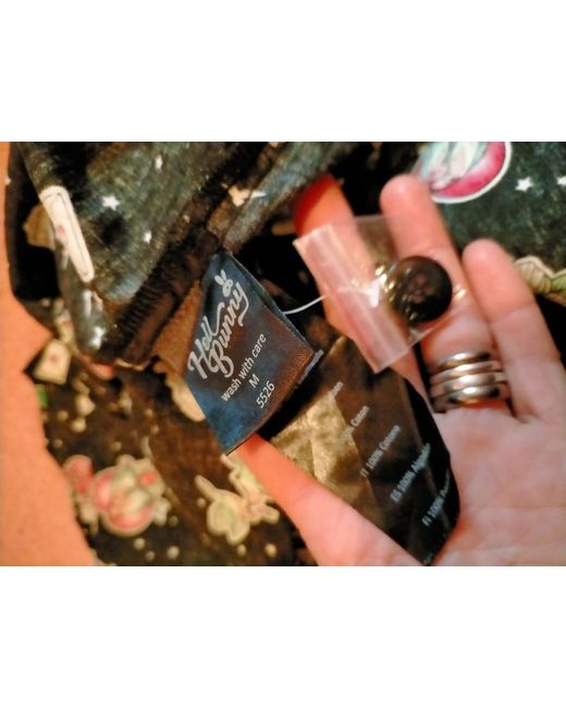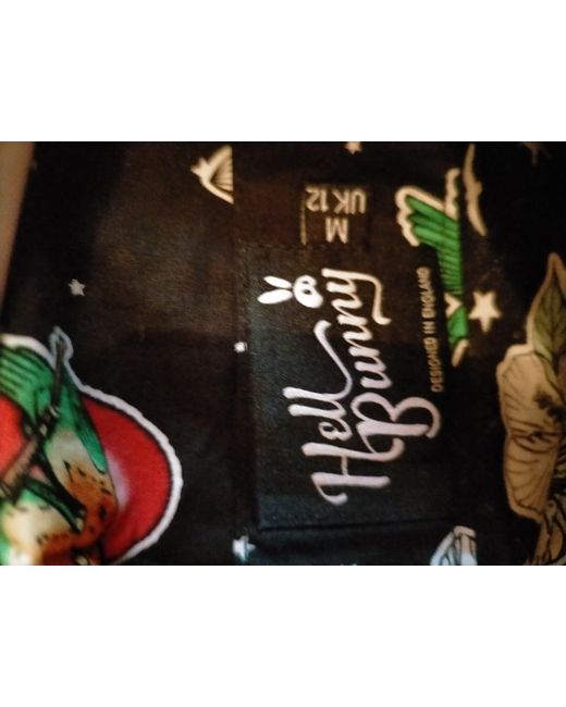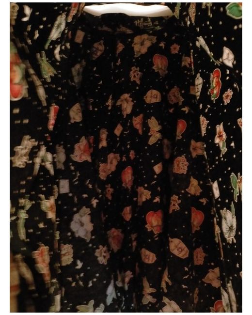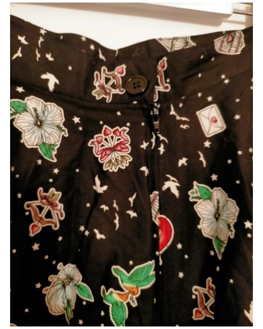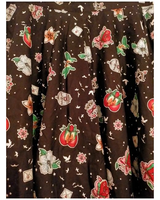 Lightweight cotton material and could be dressed up or down. Had a spare button attached to label on side of skirt. It's black with a mix of different birds printed on and white stars. It has a back zip closure with a one botton to hold the waist band closed and it has two spacious pockets.