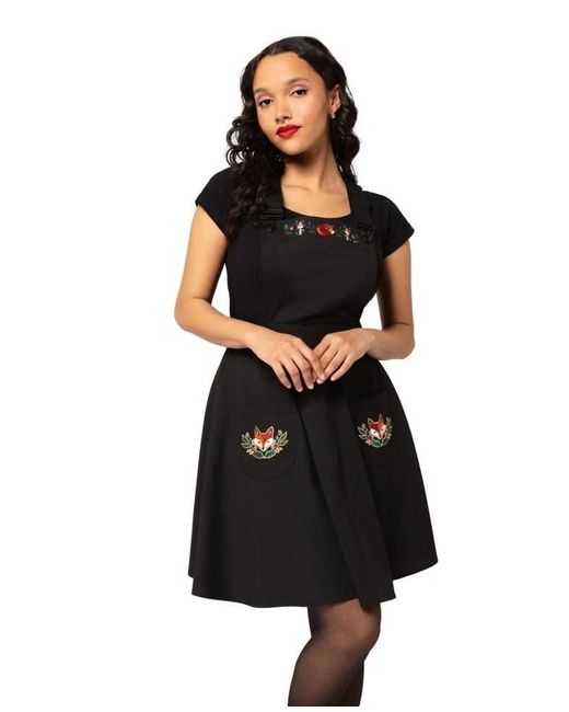 Step into a whimsical woodland with the Hell Bunny Basil Black Pinafore Dress. This enchanting dress features intricate fox and woodland embroidery on the chest and pockets, adding a touch of nature-inspired charm to your wardrobe.