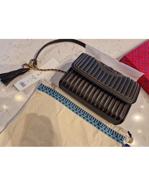 Ladylike quilting and chains: the link to a pulled-togetherlook. Thestrap is braided with brushed gold chain, and it’s convertible, so you can wearit short or long. This bag isperfect as a daily use bag and is made of black with gold studs genuine leather.