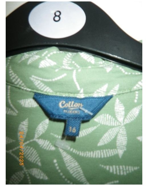 Lovely Shade Of Apple Green And White With A Leaf Pattern. This Is A Button Through Dress With Short Sleeves And 2 X Front Pockets.