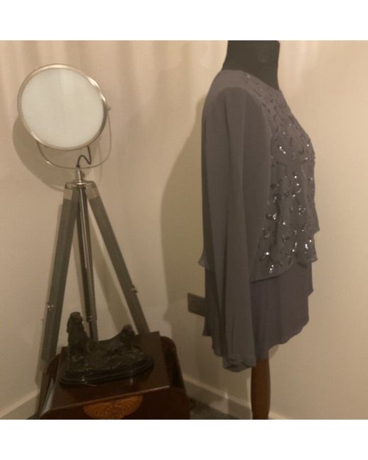 Random pattern of grey tonal sequins on the overlay. Body layer 100% Viscose. Single button fastening the back with key hole opening. Approx sleeve length shoulder to cuff 25ins. Approx length top of the shoulder to front hemline 25ins the back hemline is approx 2.5 ins longer.