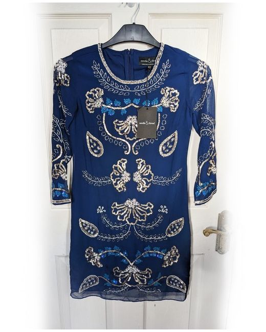 The dress is made from high-quality chiffon polyester with beaded and sequin accents and is fully lined for a comfortable fit. The fabric isn't stretchy.