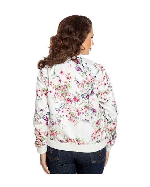 Lindy Bop 'Berrie' bomber jacket in a beautiful watercolour floral print. Classic bomber jacket design. Satin fabric with floral print. Machine washable. UK size 10. Length - 24". Side pockets.