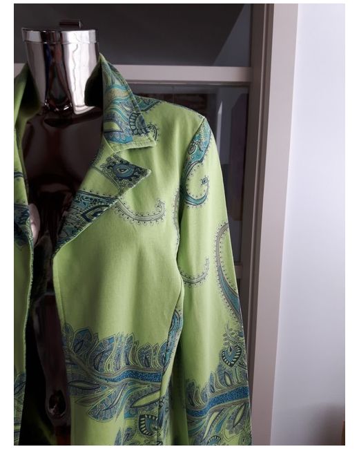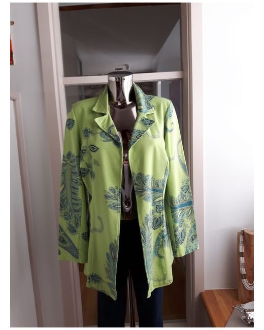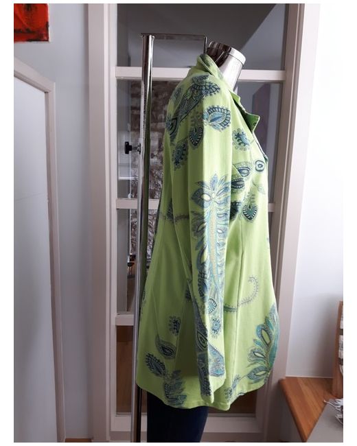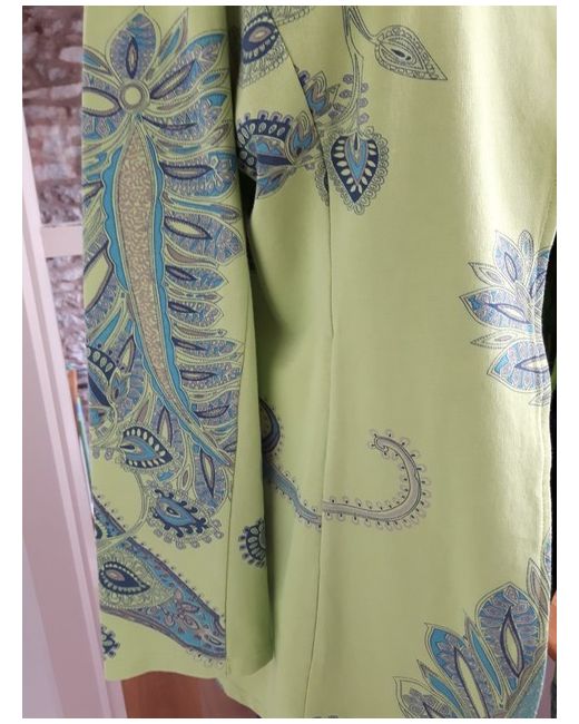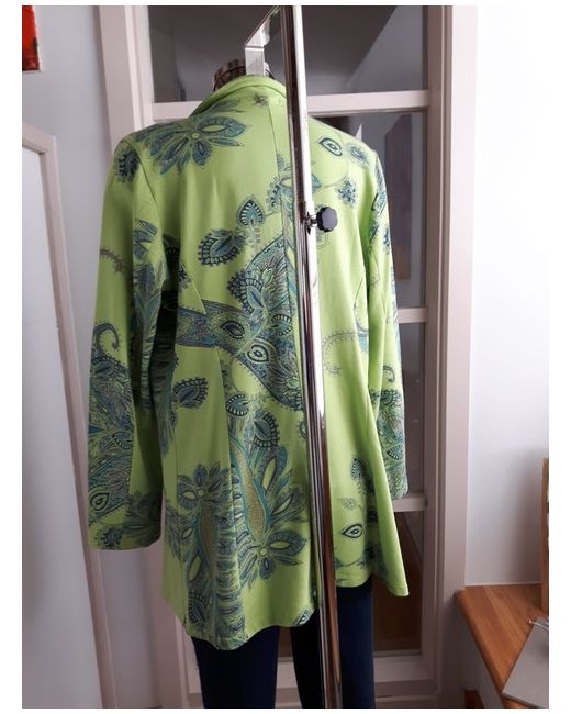 BNWT versatile edge to edge mid length cotton jersey Jacket by N & Willow. Green background with Navy/Turq Paisley design. 95% Cotton 5% Elastane. Length from nape of neck to hemline approx. UK Size L (14/16).