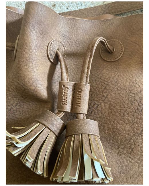 Firestrap Tan Shoulder Bag with adjustable strap. Draw string with tassel closure. Has pocket at back and inside pocket with firetrap logo and firetrap on tassels. See Pics. Bought and not used.