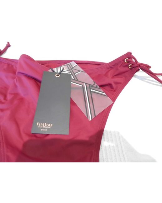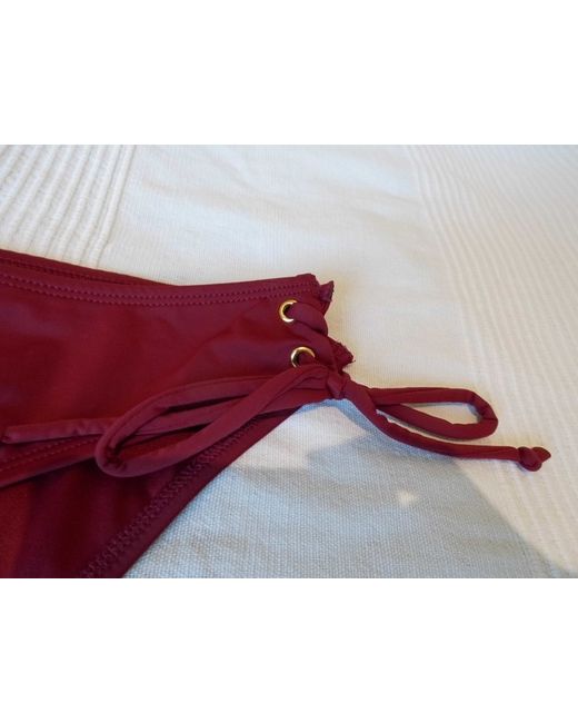 Firetrap eyelet platted tie sided bikini bottom. At the sides you have 4 gold coloured eyelets that have matching burgundy ties platted in them and tied at the bottom, these can be adjusted to be as wide or narrow as you wish.