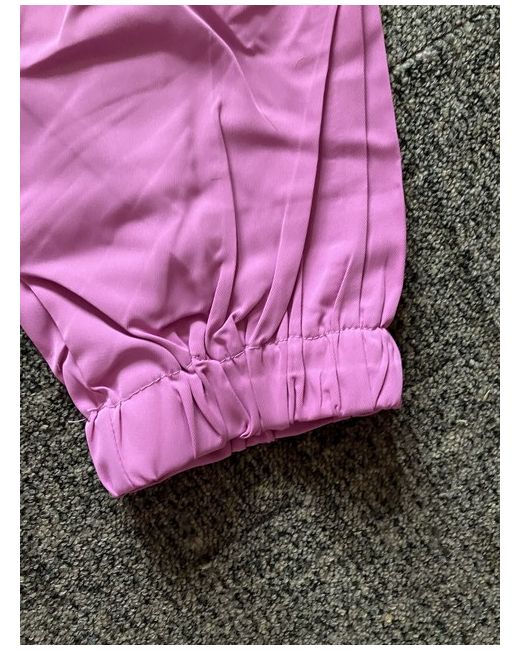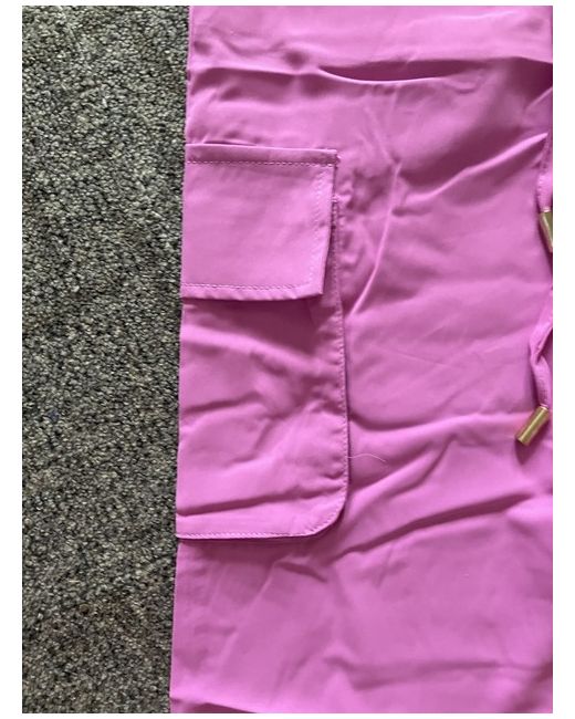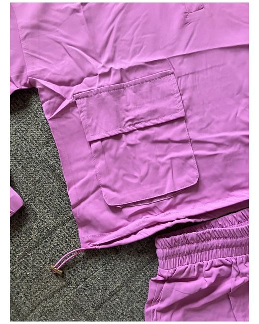 Lightweight trousers and top set. Colour states pink. And collar with button. Large front pocket. 2 open side pockets and 2 cargo style side pockets.