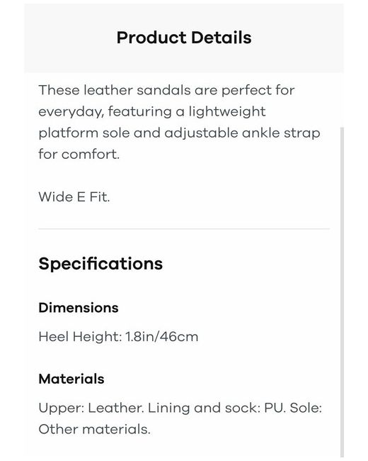 Lightweight platform sole and adjustable ankle strap for comfort. Upper: Leather. Wide E fit. Sole: other materials.