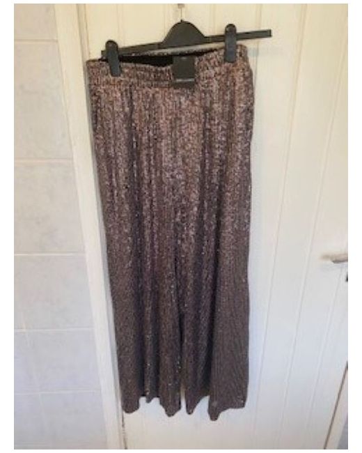 This J D Williams trousers and top are a stylish choice for women, featuring a wide-leg design in a striking bronze colour. Made from a blend of polyester and elastane, they offer a comfortable stretch fit in a size 12 regular. The trousers and top are adorned with sequin accents, adding a touch of glamour to the dress pants. Perfect for adding a touch of sparkle to your outfit, these trousers are a versatile and eye-catching addition to any wardrobe.