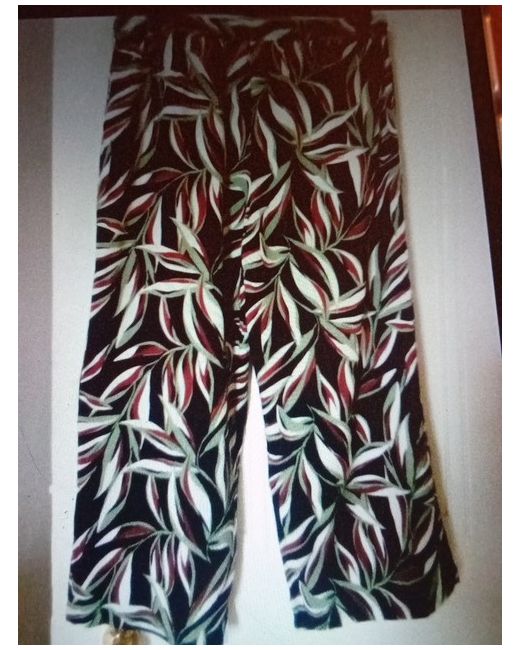 Fabulous new with super elasticated waist and tie front. Two front pockets in a gorgeous black, green, brown and white leaf design Leg tapers down from 16 inches to 13 inches wide inside leg measures 29 inches approx