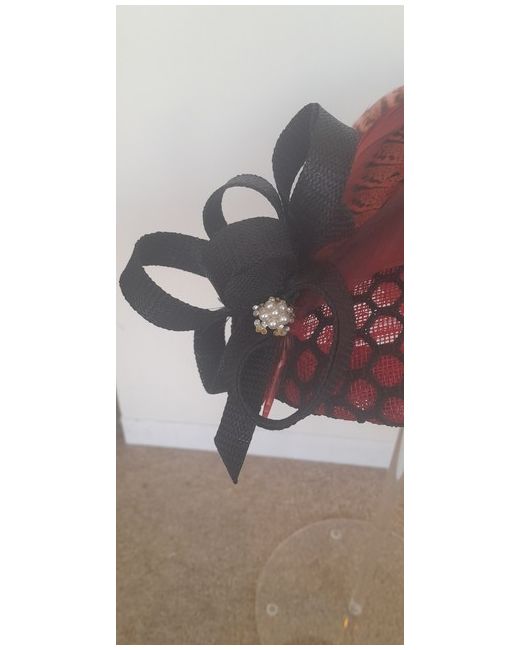 This red and black fascinator is suitable for occasions like weddings and christenings. It features a check pattern with beaded and bow accents, made of sinamay fabric. Handmade in the United Kingdom, the one size headpiece adds a touch of elegance to outfits for summer and spring events.