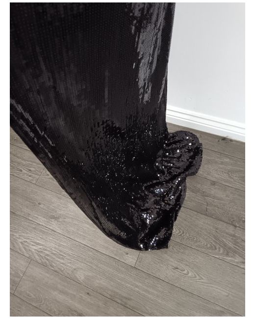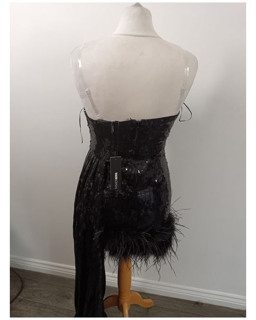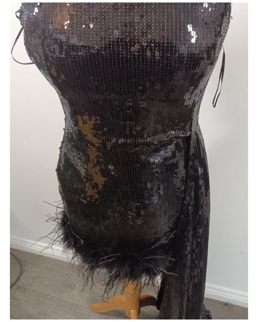 Featuring a side train with sequin and feather accents, this dress is perfect for any Christmas occasion. The dress is a size M and has never been worn, making it an ideal addition to your wardrobe.