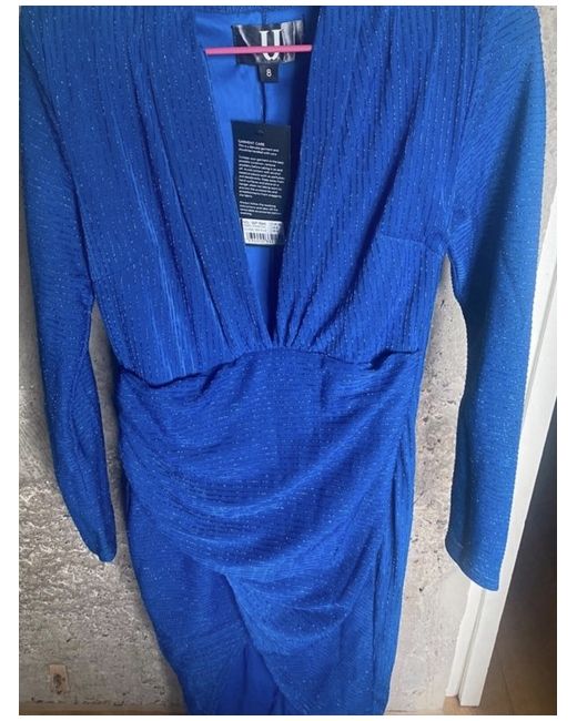 This Forever Unique wrap dress in a stunning blue colour is perfect for a special occasion like a wedding. The dress features long sleeves and falls to a midi length, making it both elegant and stylish.