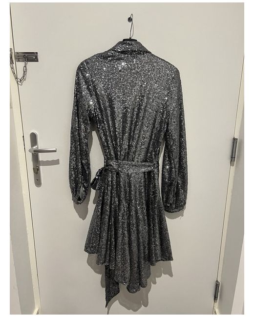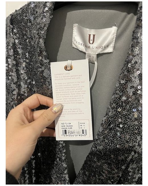 Be the shining star of any party with this Forever Unique sequin party dress. The dress features a flattering fit and flare style with a knee-length hemline and a V-neckline. The dress is covered with shimmering sequins, adding a touch of glamour to the overall look. Perfect for any occasion, this dress is lined for comfort and made from high-quality materials to ensure durability. The XS size is suitable for women looking for a regular fit. Don't miss out on the chance to make a statement with this stunning silver dress.