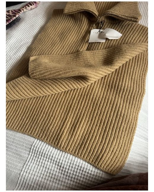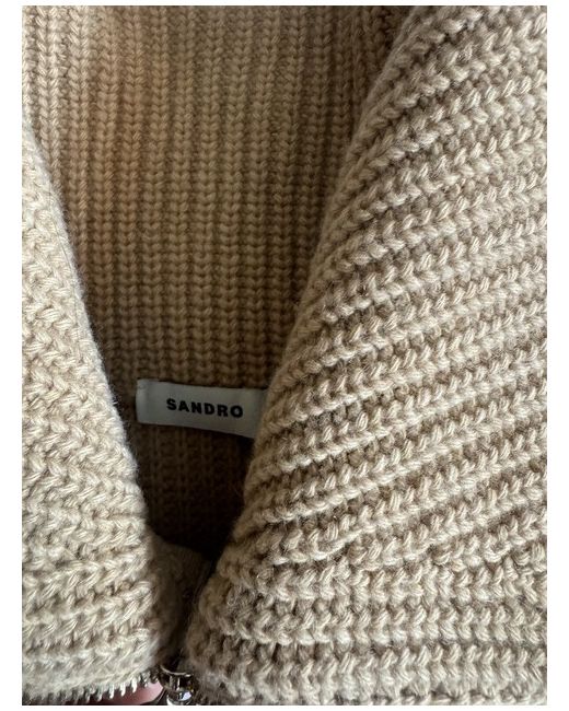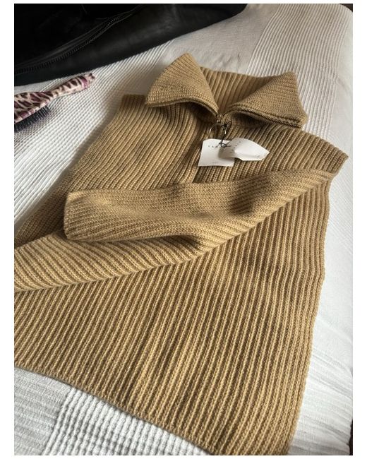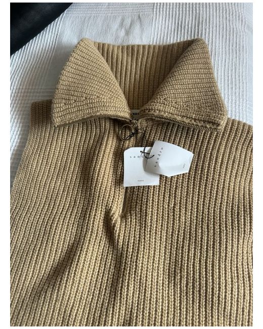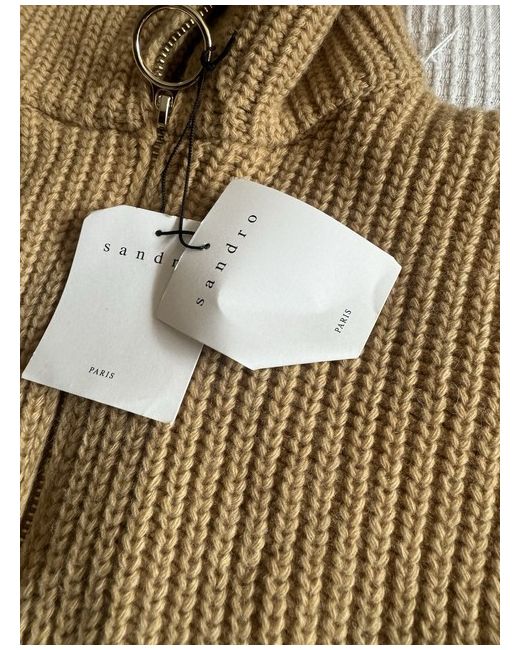 Elevate your wardrobe with this stunning Sandro jumper in a beautiful camel colour. Crafted from a high-quality wool blend, this pullover is both comfortable and stylish. The one-size-fits-all design is perfect for any woman looking to add a chic piece to their collection. Featuring a unique high-neckline and made from luxurious materials, this jumper is perfect for any occasion. The Sandro brand is known for its exceptional quality and attention to detail, making this piece a must-have for any fashion-forward woman. Details Dickey Wool-blend Ribbed Logo-appliquéd Zip fastening along front Mid-weight knit Hand wash or dry clean Made in Italy 80% Wool 20% Polyamide