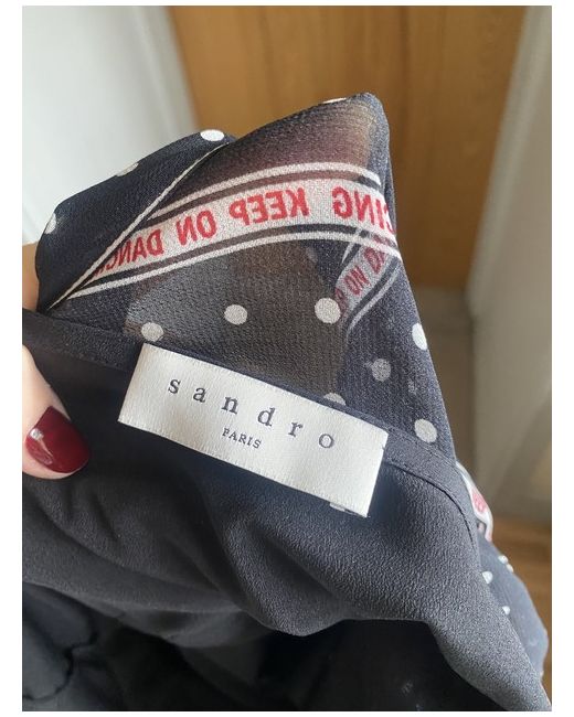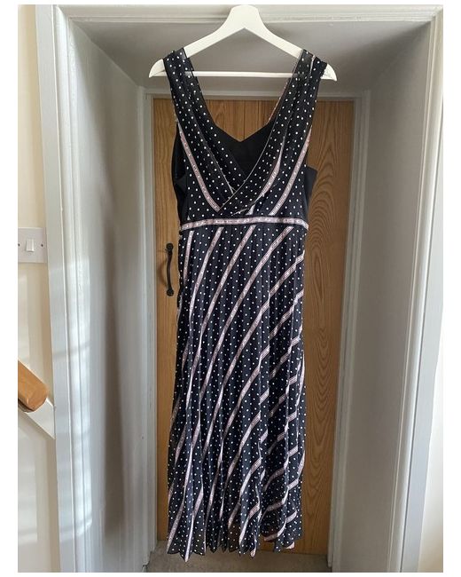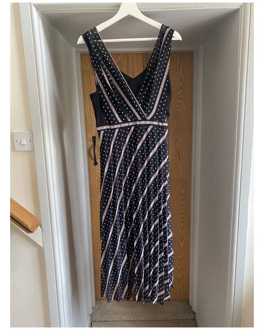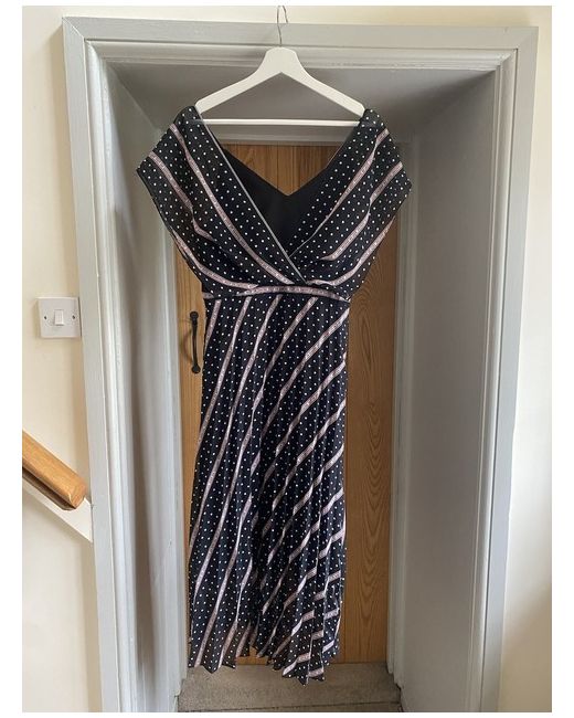 Crossover bodice, empire waist, midi length. Allover polka dot print with graphic lettered stripes. Never worn black dress, comfortable fit and flattering.
