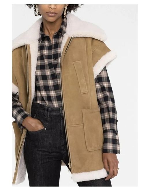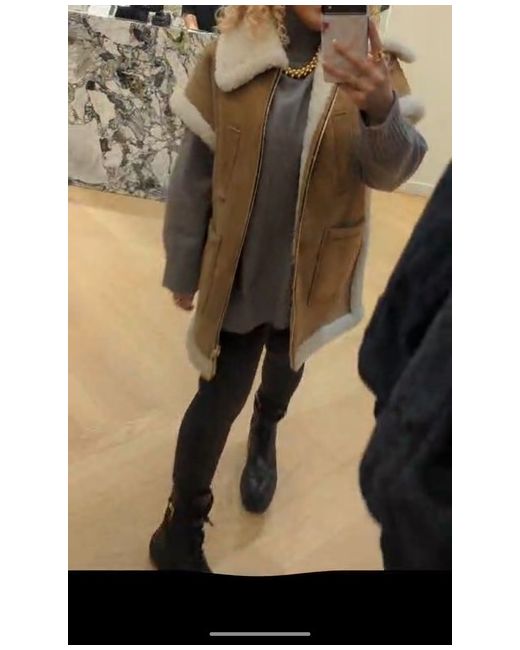 Elevate your winter wardrobe with this stunning Sandro sheepskin coat. Crafted from high-quality shearling leather and lined with soft leather, this mid-length coat is perfect for casual occasions. The coat features a full zip, oversized fit, and fur-trimmed accents, making it both stylish and functional for the colder seasons. The beige colour and wool insulation material make it suitable for both autumn and winter. This real sheepskin coat is a must-have for any fashion-forward woman who wants to make a statement while staying warm and comfortable.