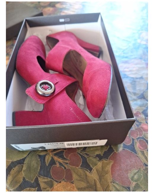 Once worn Tamaris court style shoe with strap and an attractive velcro button fitting. In a as new condition with original box.
