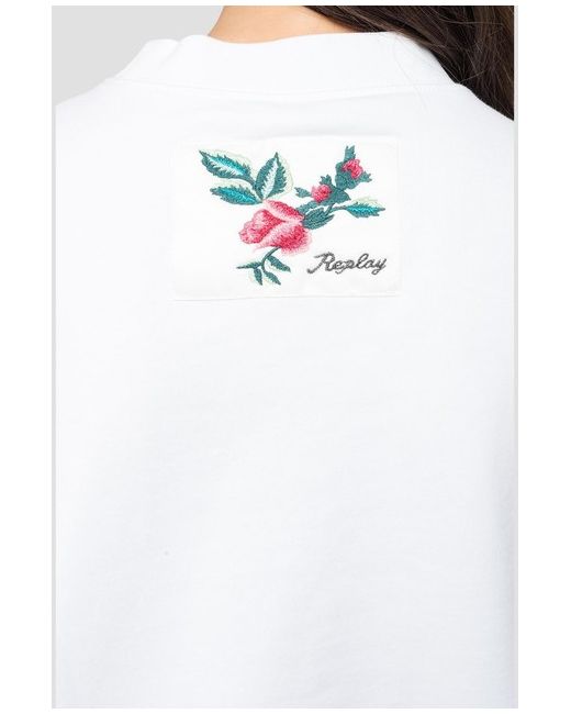 Replay W3269c Basic Crew Neck Sweatshirt with REPLAY floral embroidery, White Replay Sweatshirt with REPLAY floral embroidery cotton sweatshirt, sleeves with dropped shoulders, elasticated cuffs, round neck, ribbed collar, cuffs and hemline, satin label with embroidered floral pattern on the back with REPLAY writing.