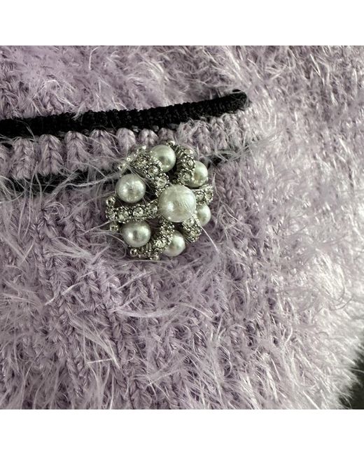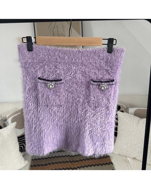 SELF PORTRAIT Self Portrait Fluffy Knit Skirt in Lilac with a Block Colour Finish, Diamante Embellished Button and Mini Length Size 14/Large New RRP £180 New with Tags