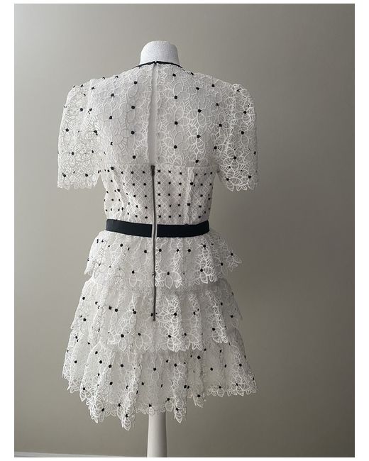 White openwork dress with short sleeves from Self Portrait. Fastened with a zip and a hook. Decorated with a floral motif in white and black. Black grosgrain strap at the waist. Padded top.
