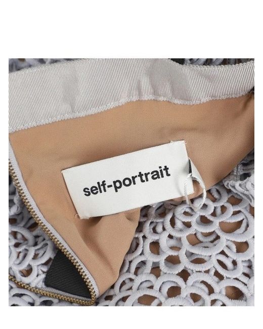 This off shoulder mini dress with neckline strap detail features a graphic floral guipure lace with a two tier full mini skirt. The silhouette is waisted with a contrasting black grosgrain and fastens at the back with a concealed zip for a clean finish.