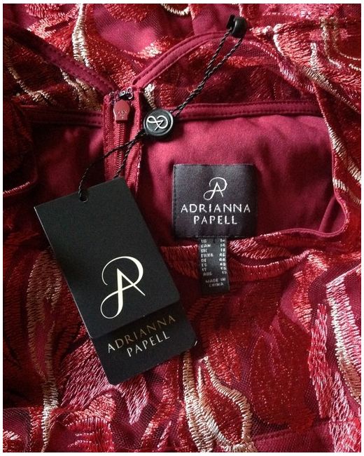 ADRIANNA PAPELL. Fully Lined, Red Multi, Scroll Embroidered, Sheath, Cocktail Party Dress. Red and gold scroll embroidered dress. Labelled a UK 18. Concealed zip, hook-and-eye closure at the back.