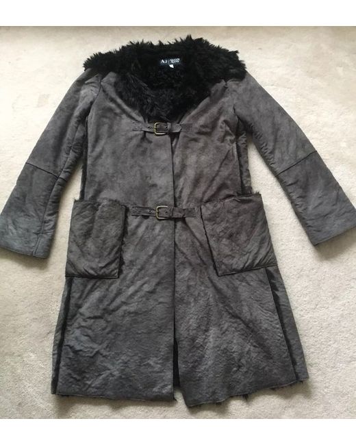 Grey, plush Armani Jeans coat with gold buckles. Exterior of the coat is in a suede material and included two large outer-side pockets and contains a black fur lining.