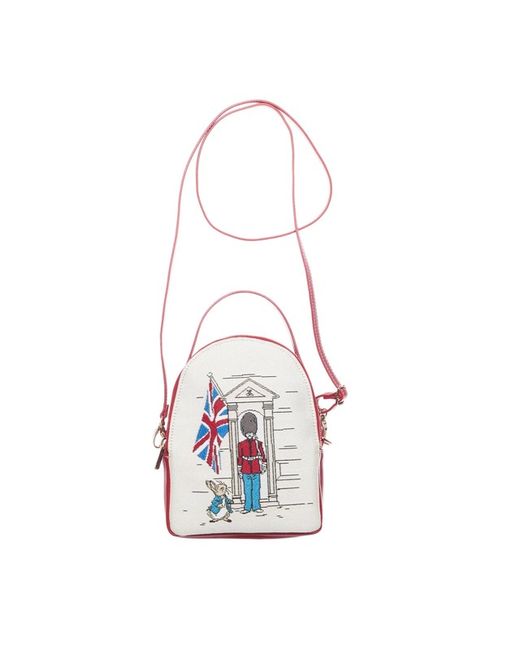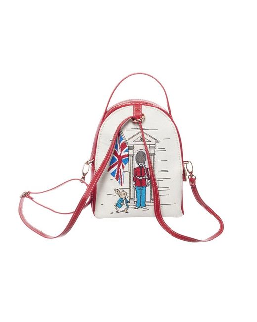 Featuring a design exclusive to Signare Tapestry. The main body of the bag is made of durable polyester tapestry fabric in an off white/cream colour. Highlighted with red faux leather details. The pattern on the main body features an embroidered design from Signare's Peter Rabbit Victorian Range.
